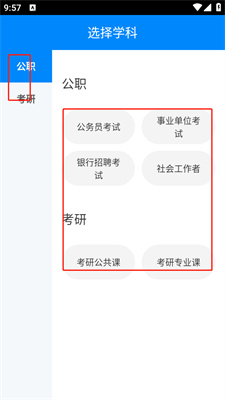 1、进入到要你来选择学科,这里公职,考研,以及公务员考试,事业单位考试等等!